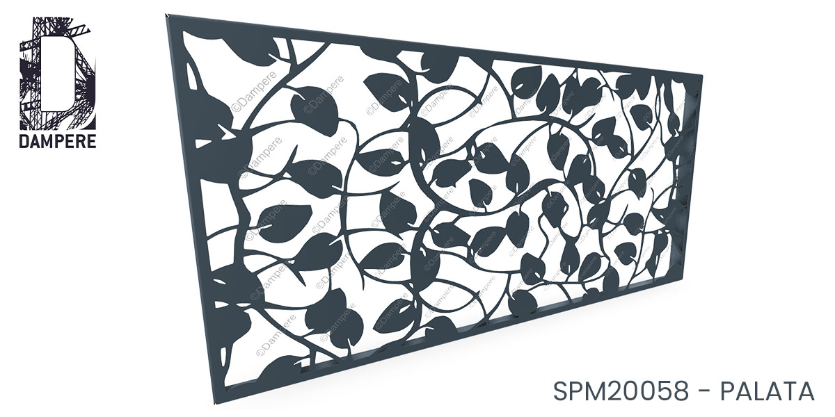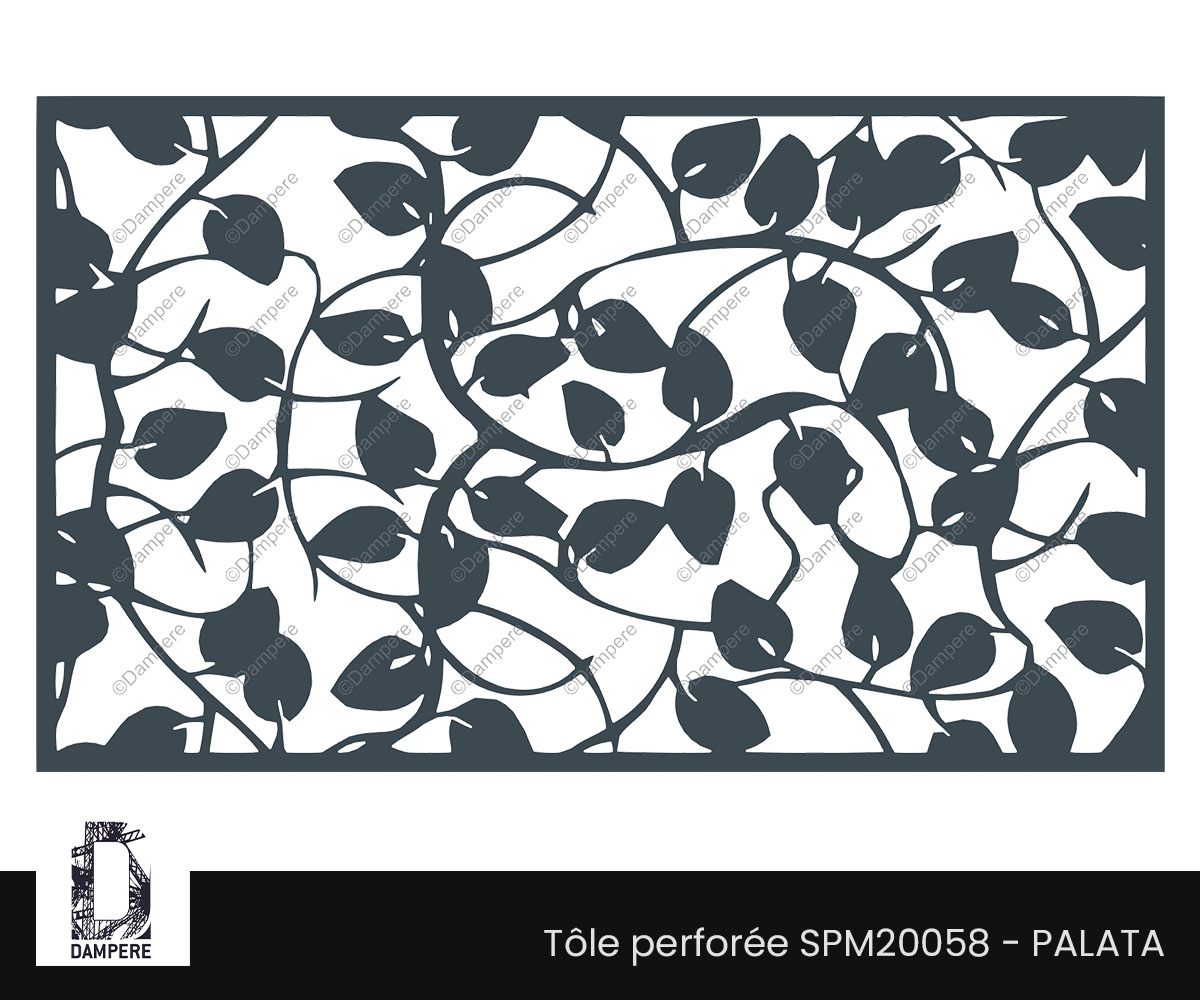 Le panneau en découpe laser végétale Palata présente un motif de feuillage, composé de longues lianes sinueuses qui s'entrelacent délicatement, formant un réseau fluide et organique de feuilles stylisées. Découpé au laser avec précision, ce design végétal offre une transparence subtile à hauteur de 53 % de vide, créant un équilibre harmonieux entre lumière, intimité et décoration.